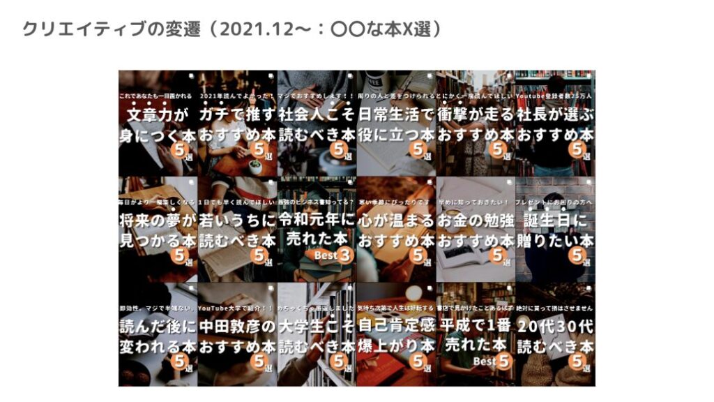 伸び始めたタイミングでは、クリエイティブの形も大きく変えました。本の写真中心のフィードから、Canvaを使った文字メインのデザインへ。5年半前はフィード投稿が伸びやすい時期でもあり、1投稿で100万リーチ超、4,000〜6,000フォロワー増といったバズも生まれたと言います。同時に、投稿頻度も